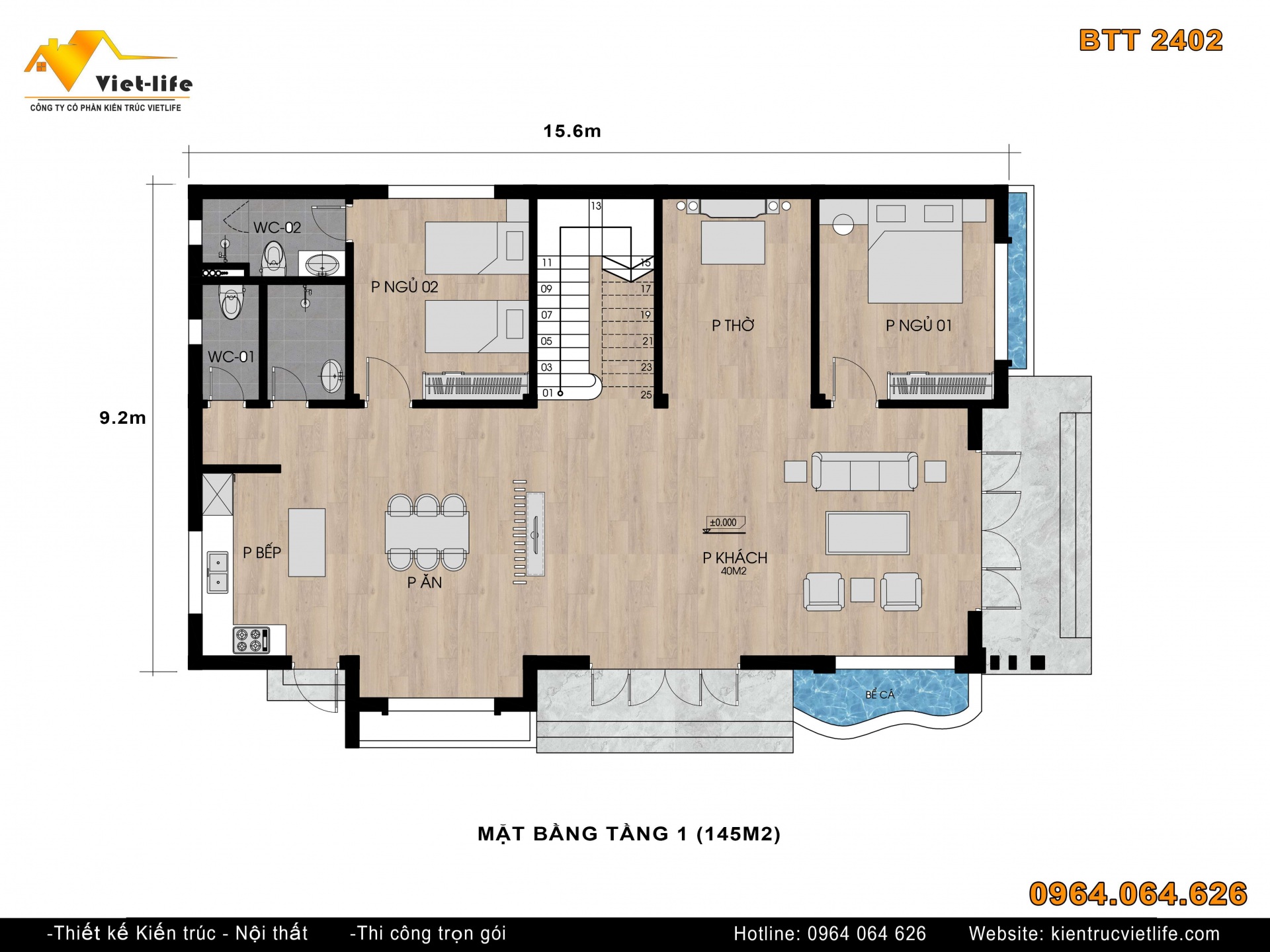 Kích thước xây dựng : 9.2x15.6m