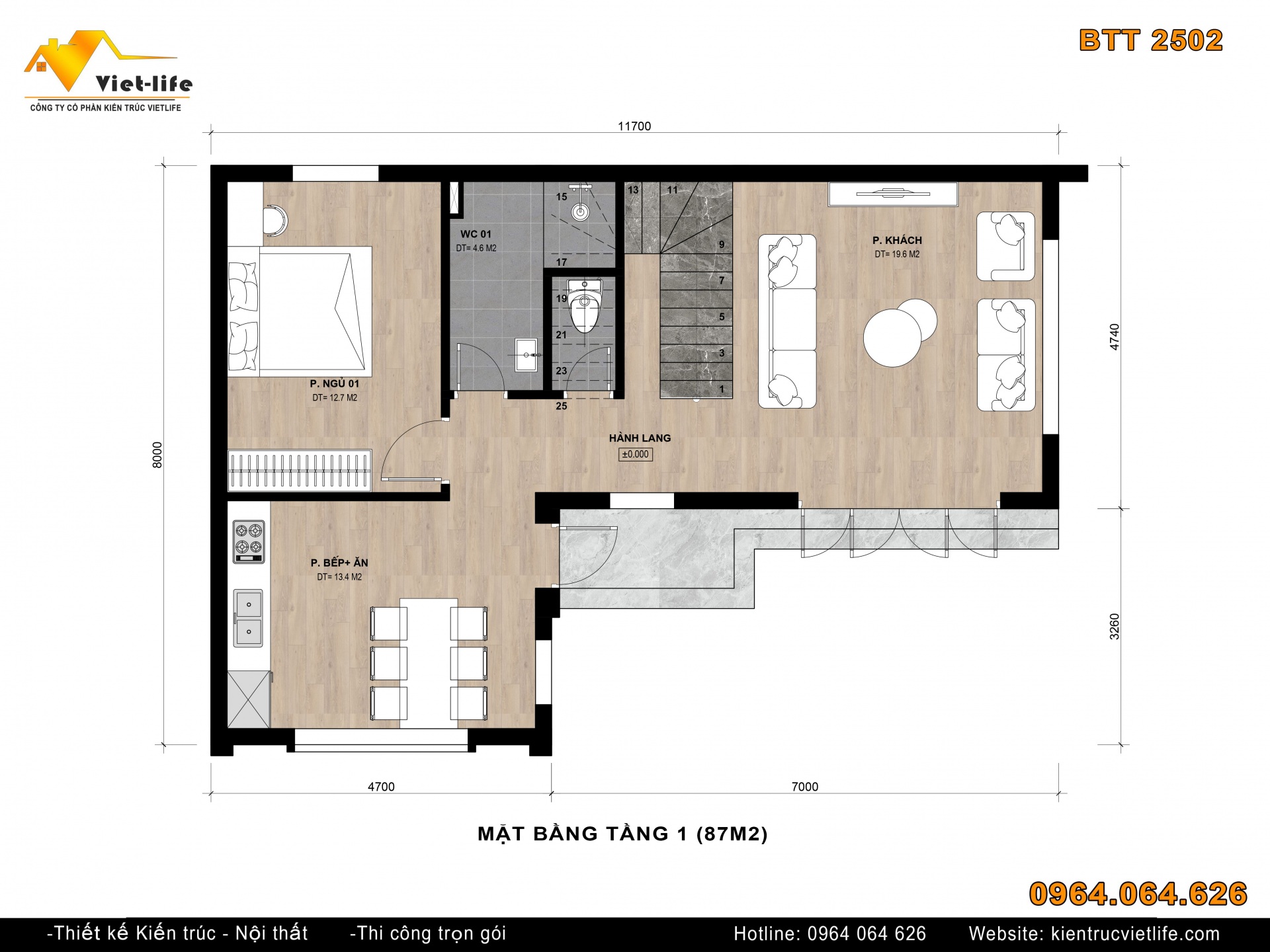 Tầng 1: phòng khách rộng, phòng bếp – ăn, 1 phòng ngủ, khu vệ sinh và sảnh đón.
