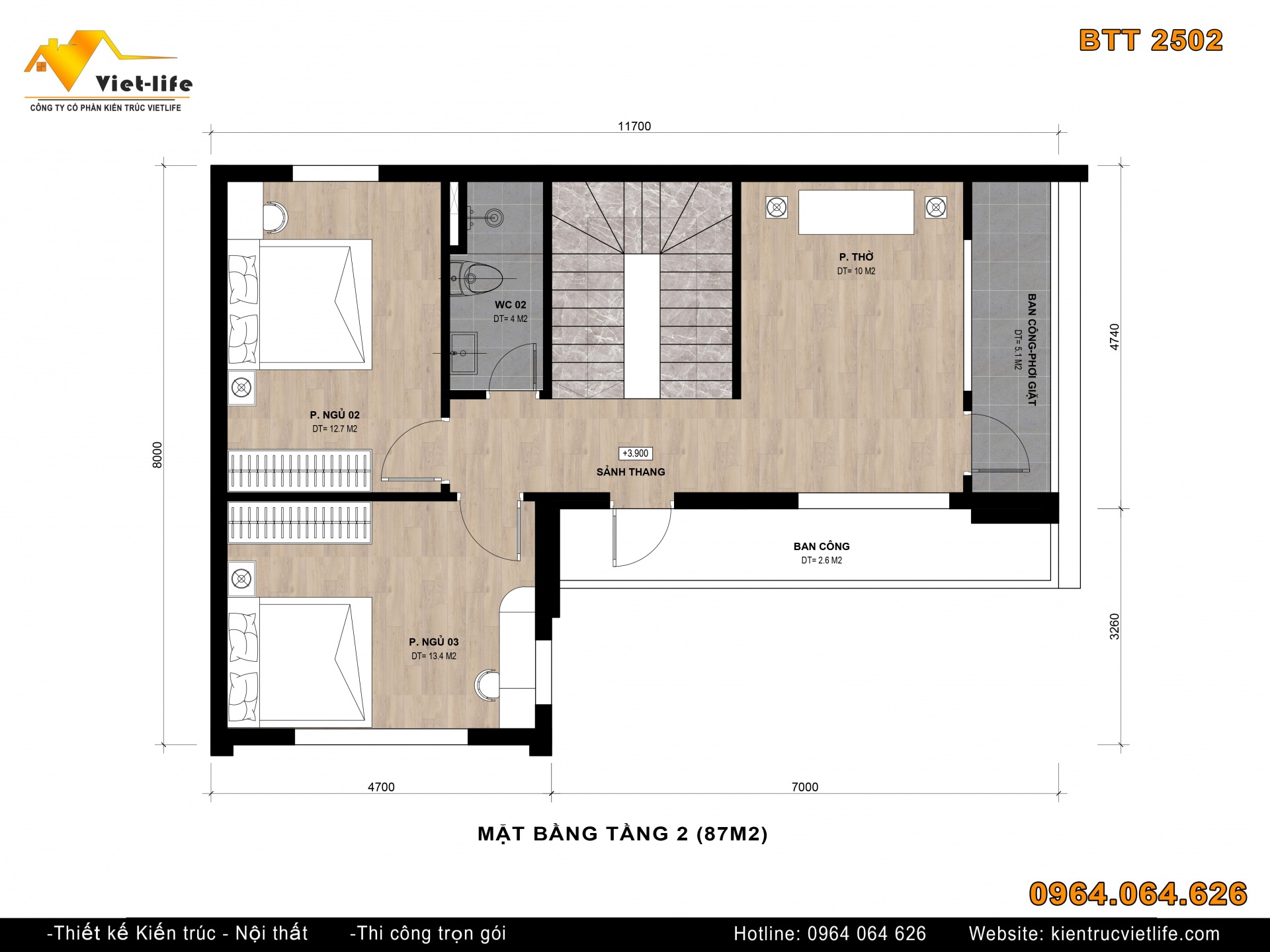 Tầng 2: 2 phòng ngủ, phòng thờ, ban công lớn và sân phơi.