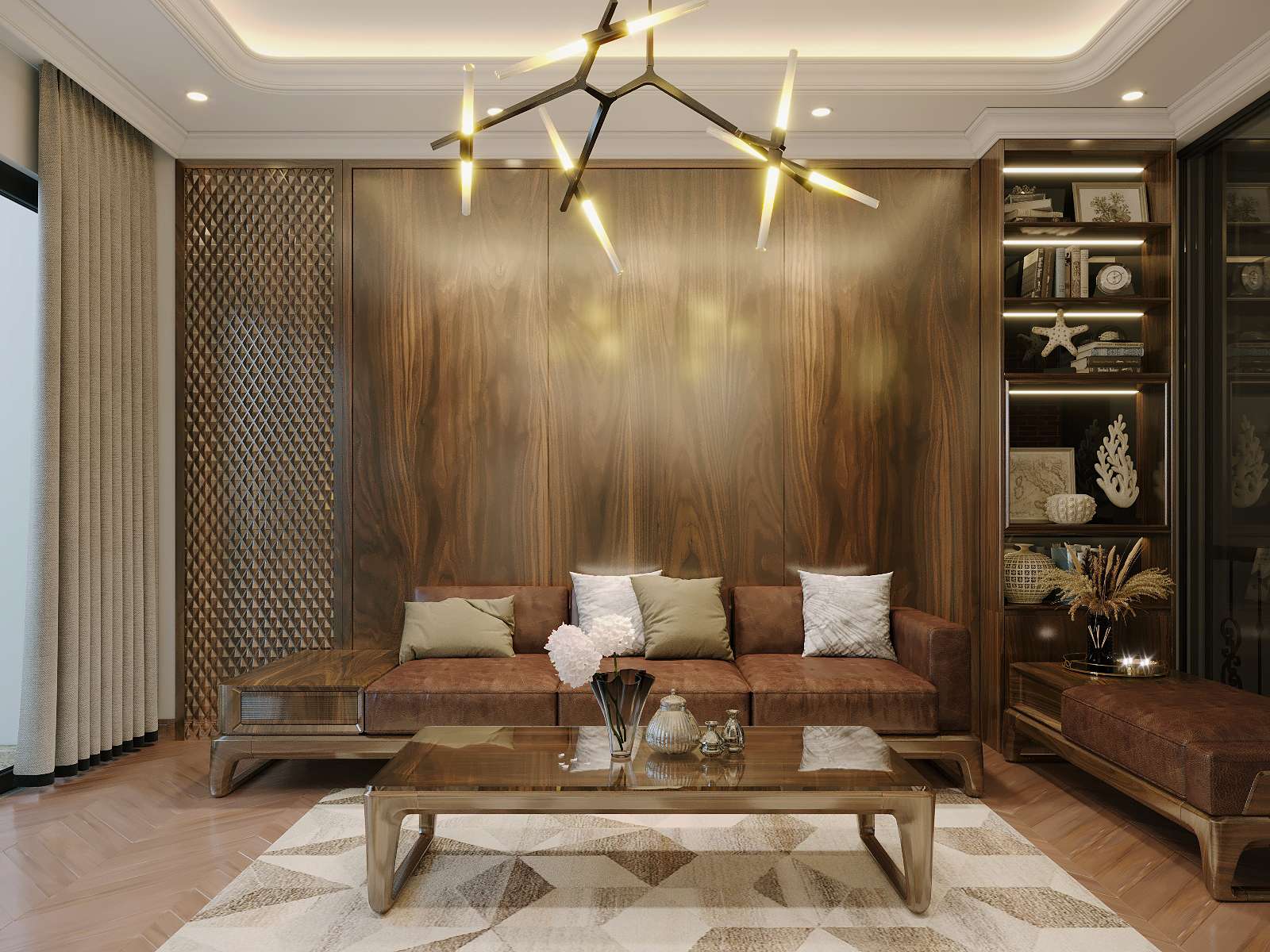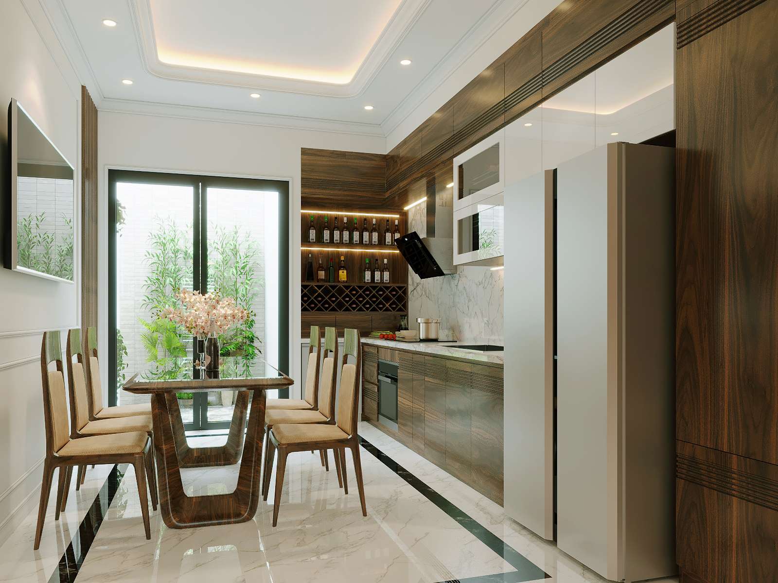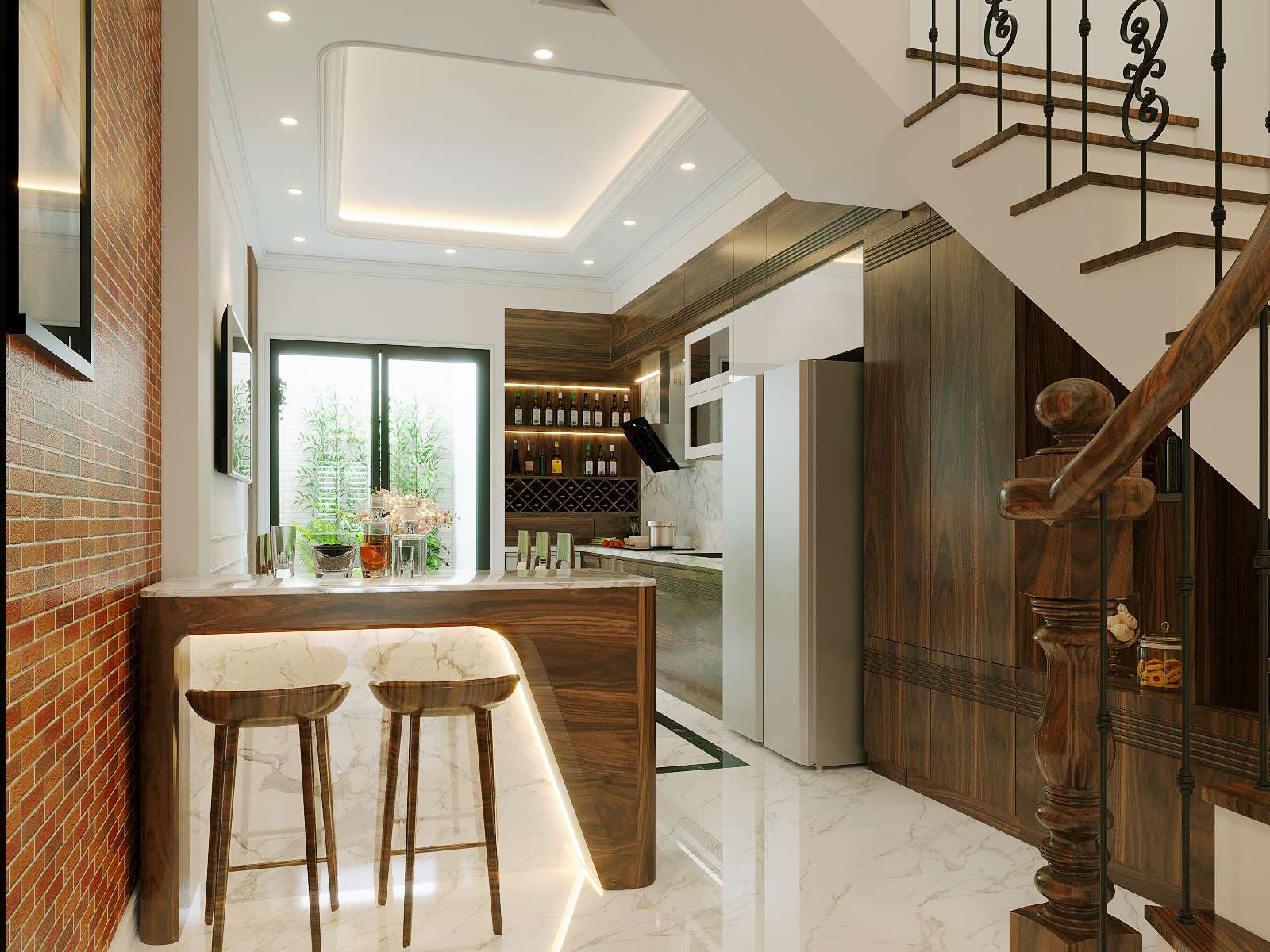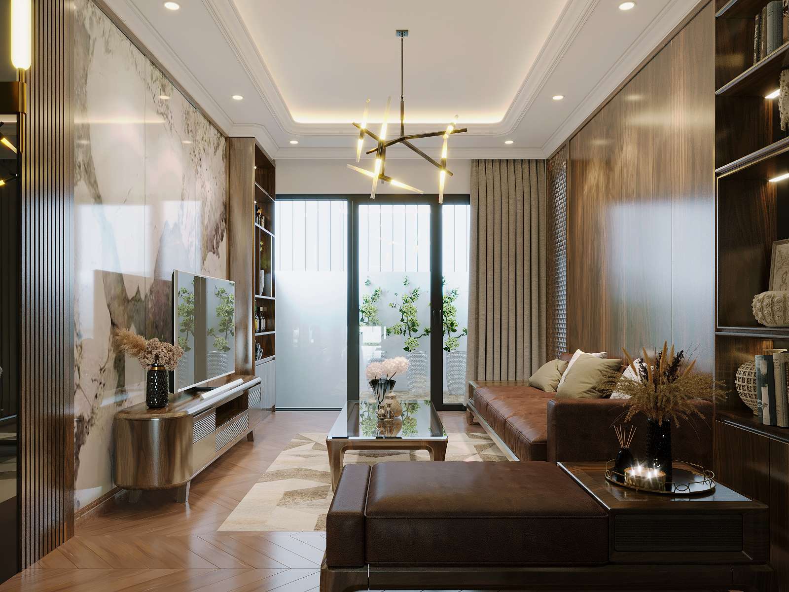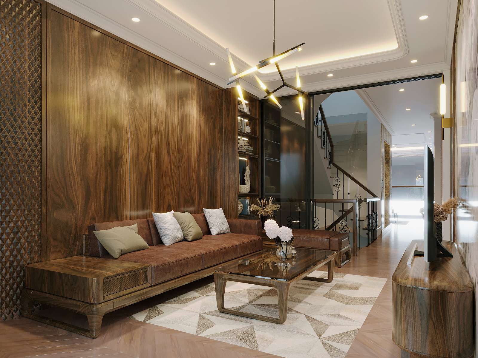 Nội thất nhà ở liền kề phong cách hiện đại với tone màu gỗ ấm cũng, sang trọng