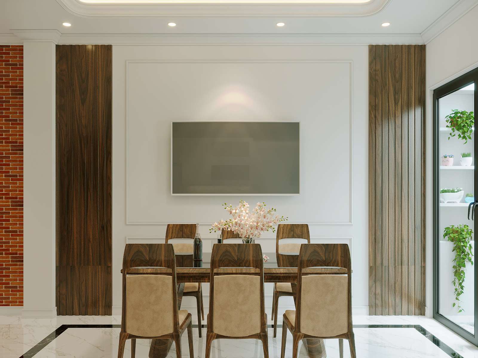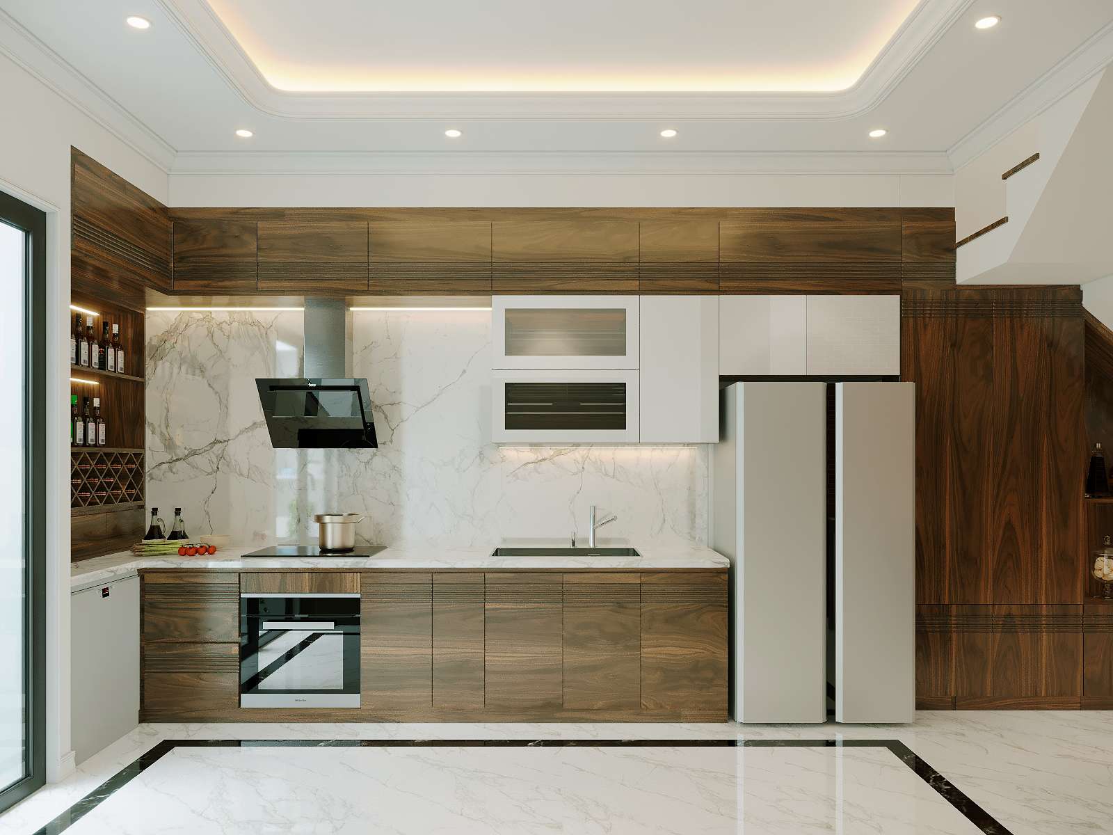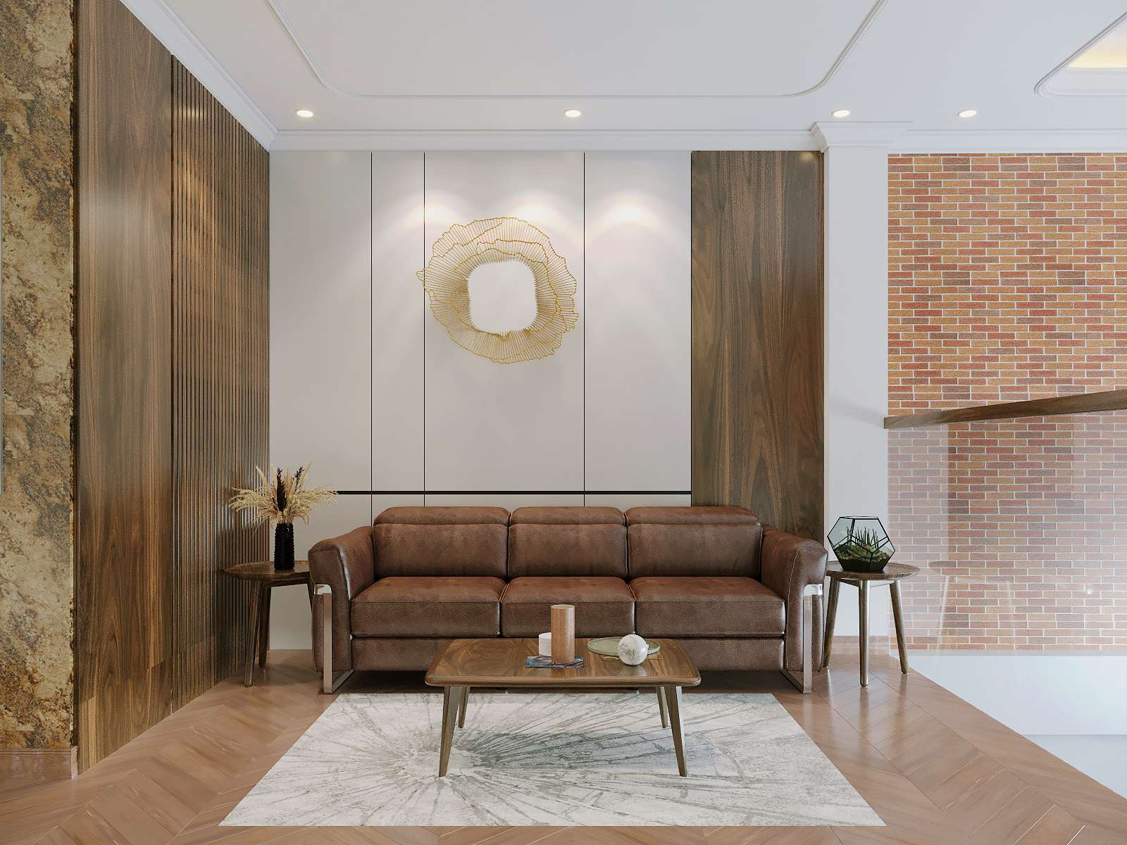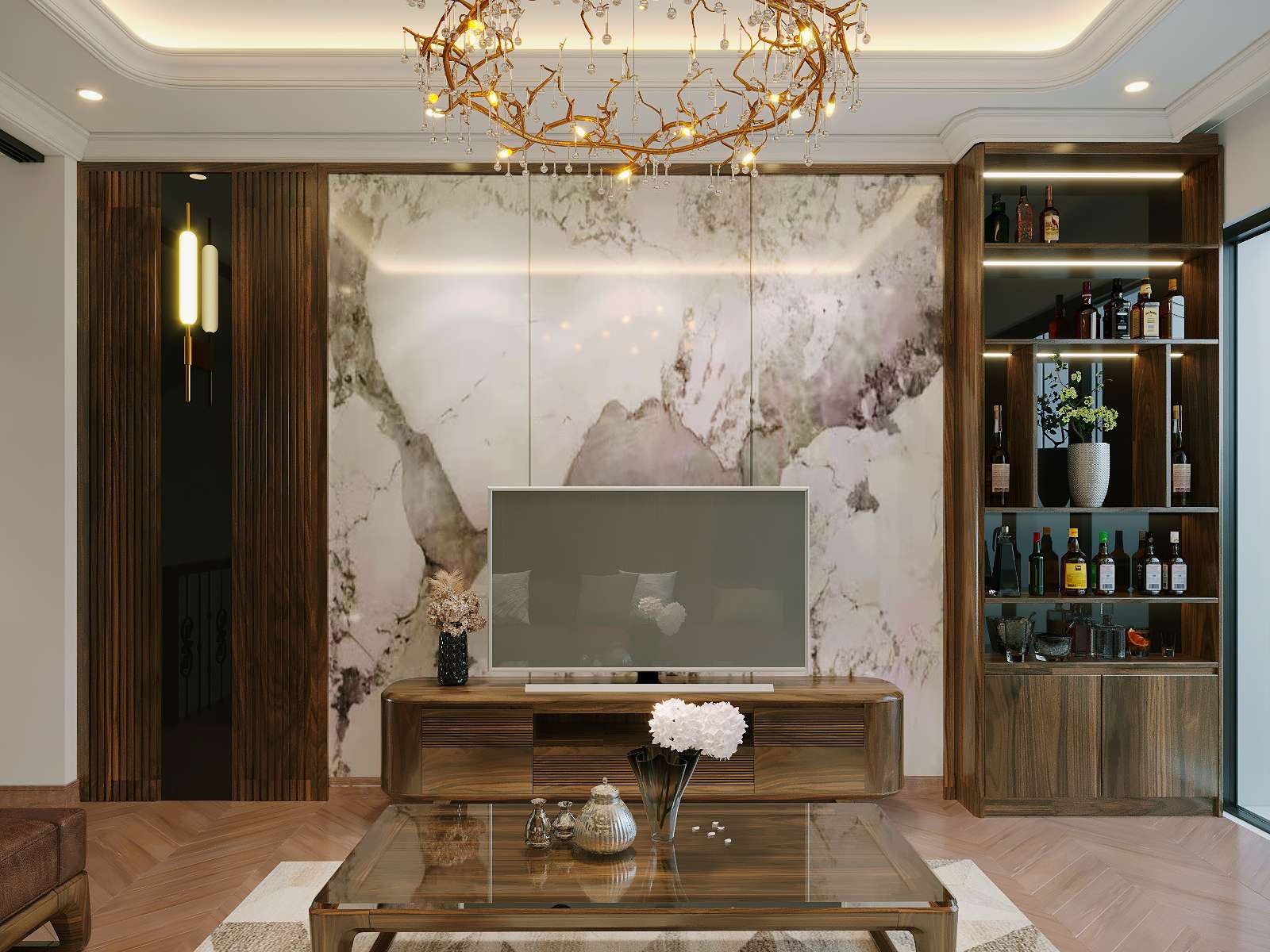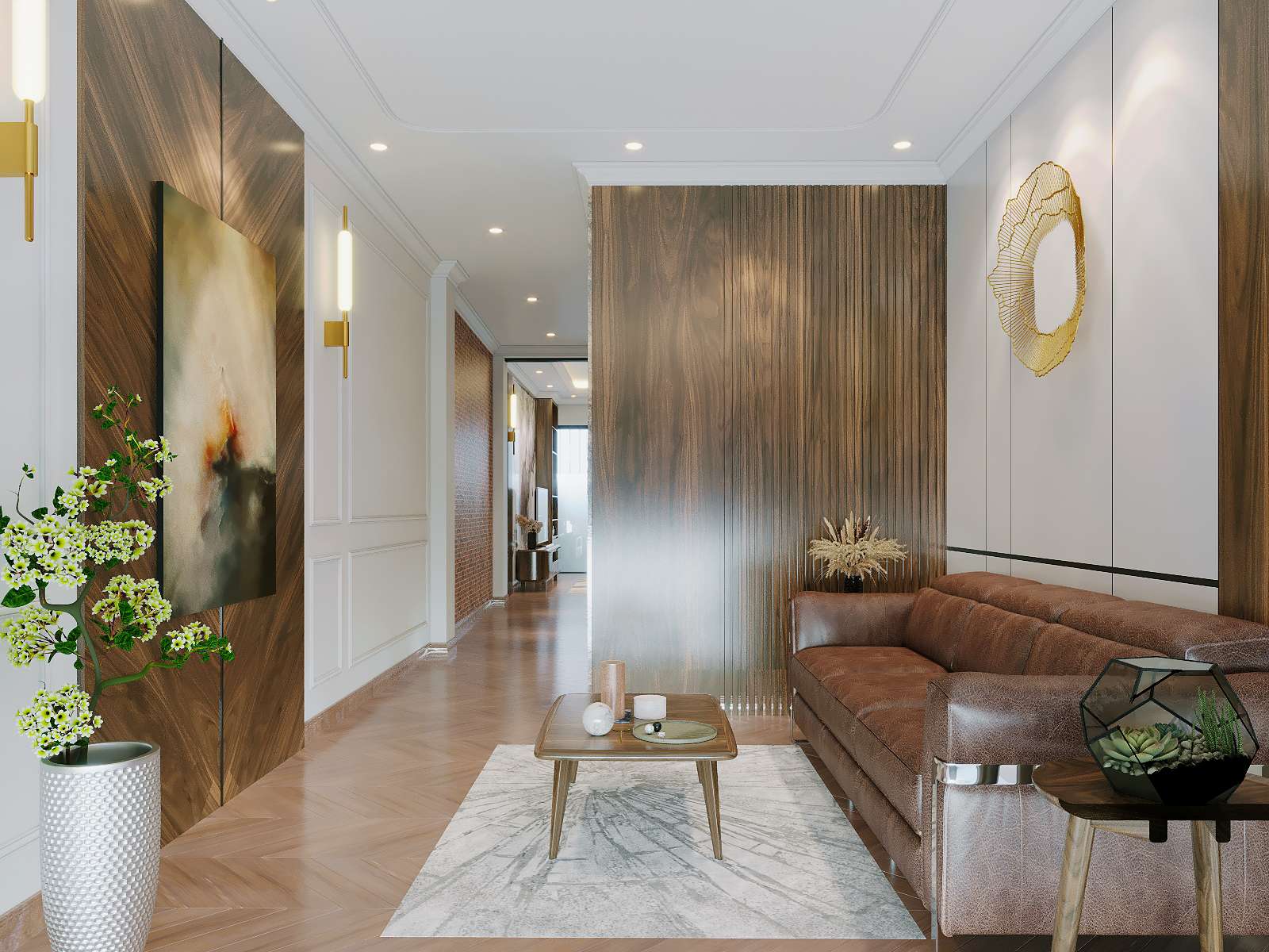 Nội thất nhà ở liền kề phong cách hiện đại với tone màu gỗ ấm cũng, sang trọng